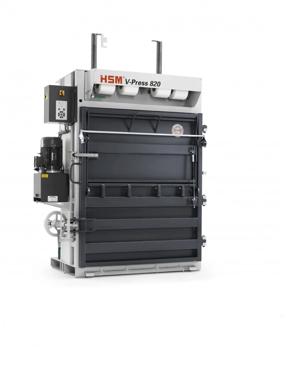 Belownica HSM V-Press 820 plus z klapą załadowczą i ręcznym kołem zamykającym produkuje bele o wadze do 250 kg.
