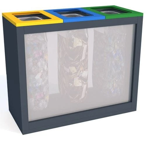 Kosz do segregacji odpadów Satis III 60 L, składa się z 3 pojemników do segregacji odpadów. Wykonany z blachy 1 mm i poliwęglanu litego 5mm, który tworzy front kosza.