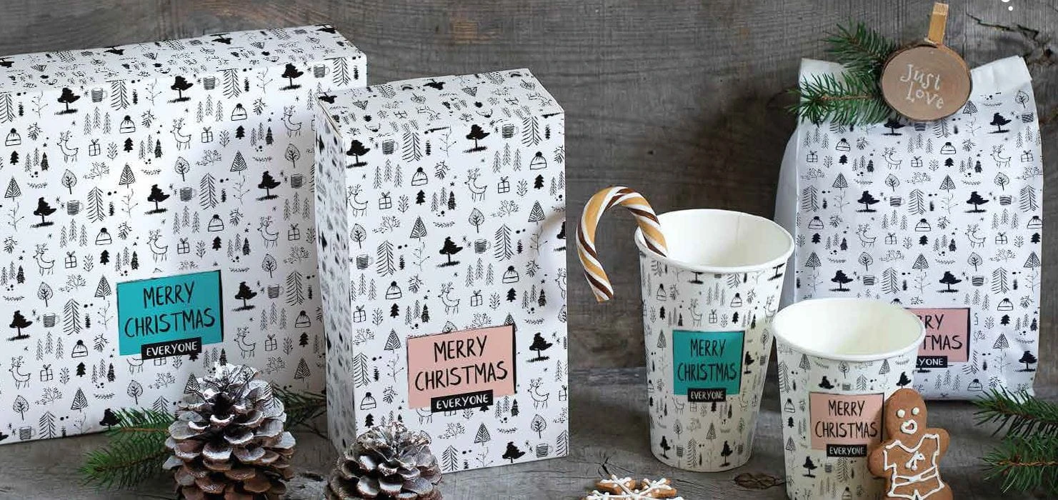 Papier pakowy Świąteczny - atestowany, powlekany PE, z nadrukiem świątecznym Merry Christmas w nowoczesnej grafice i skandynawskim stylu. Stosowany zwykle do serów, wędlin oraz w piekarnictwie i cukiernictwie. Nadruk dostępny jest także na kubkach, pudełkach cukierniczych i torebkach.