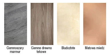 Okleiny winylowe: ciemnoszary marmur, ciemny drzewo tekowe, bladozłoty, matowa miedź