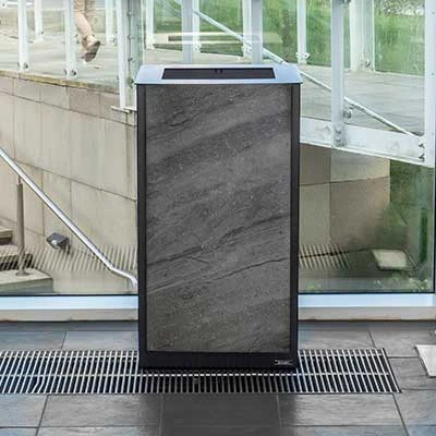 Kosz wykonany jest ze stali z powłoką Armortec i aluminiowego profilu drzwi Vandalex™. Stalowa rama pokryta Armortec i panele korpusu w 100% nadają się do recyklingu.