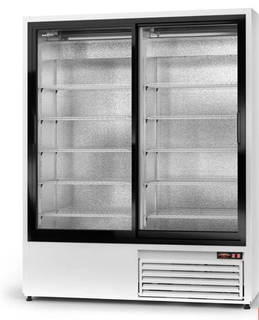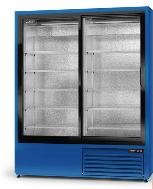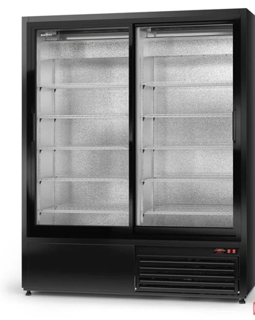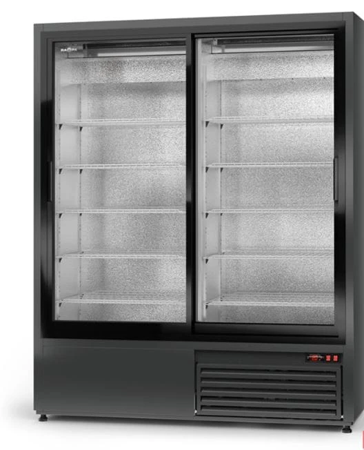 Dwukomorowa szafa chłodnicza z przeszklonymi rozsuwanymi drzwiami oraz oświetleniem LED, dzięki czemu produkty znajdujące się w niej są doskonale widoczne.