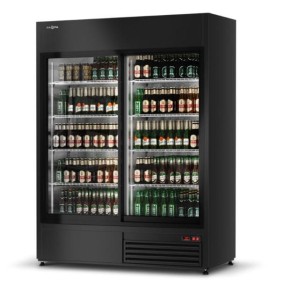 Dwukomorowa szafa chłodnicza z przeszklonymi rozsuwanymi drzwiami oraz oświetleniem LED, dzięki czemu produkty znajdujące się w niej są doskonale widoczne.