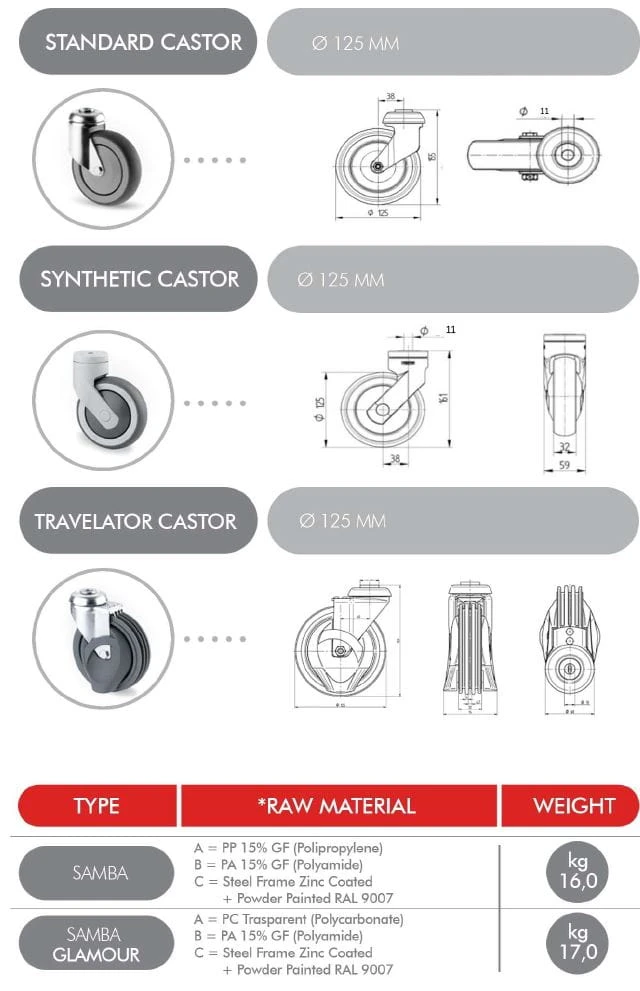 Wózek standardowo wyposażony jest w kółka z metalowym widelcem o średnicy 125 mm, istnieje również możliwość zamówienia kółek z plastikowym widelcem oraz kółek na ruchome chodniki (Ø125 mm).