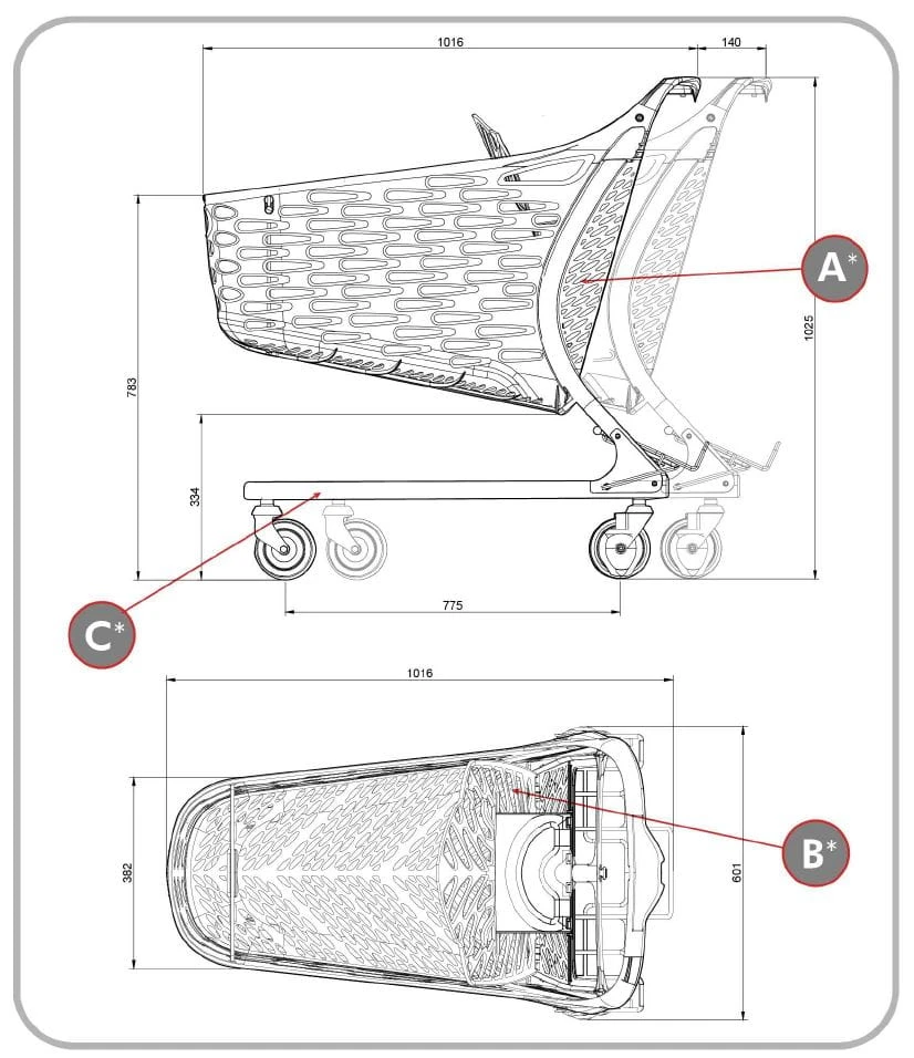 Wózek może zostać spersonalizowany poprzez umieszczenie etykiety z logo sklepu na przodzie kosza oraz na rączce wózka.