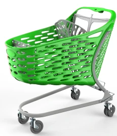 Wózek sklepowy Rabtrolley Samba Eko Color jest to model hybrydowy o pojemności 130L, w którym kosz ze zintegrowaną rączką wykonany z tworzywa sztucznego jest osadzony na stalowej ramie.