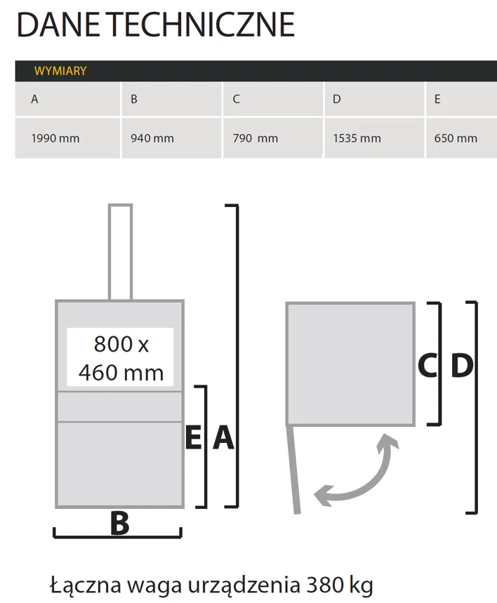 - otwór załadowczy: szerokość - 800 mm, wysokość - 460 mm