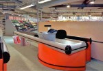 Boks kasowy z zaokrągloną kabiną kasjerki. Dla sklepów 400-1000 mkw. Wymiary: długość 460 cm, wysokość 95 cm, szerokość 190 cm