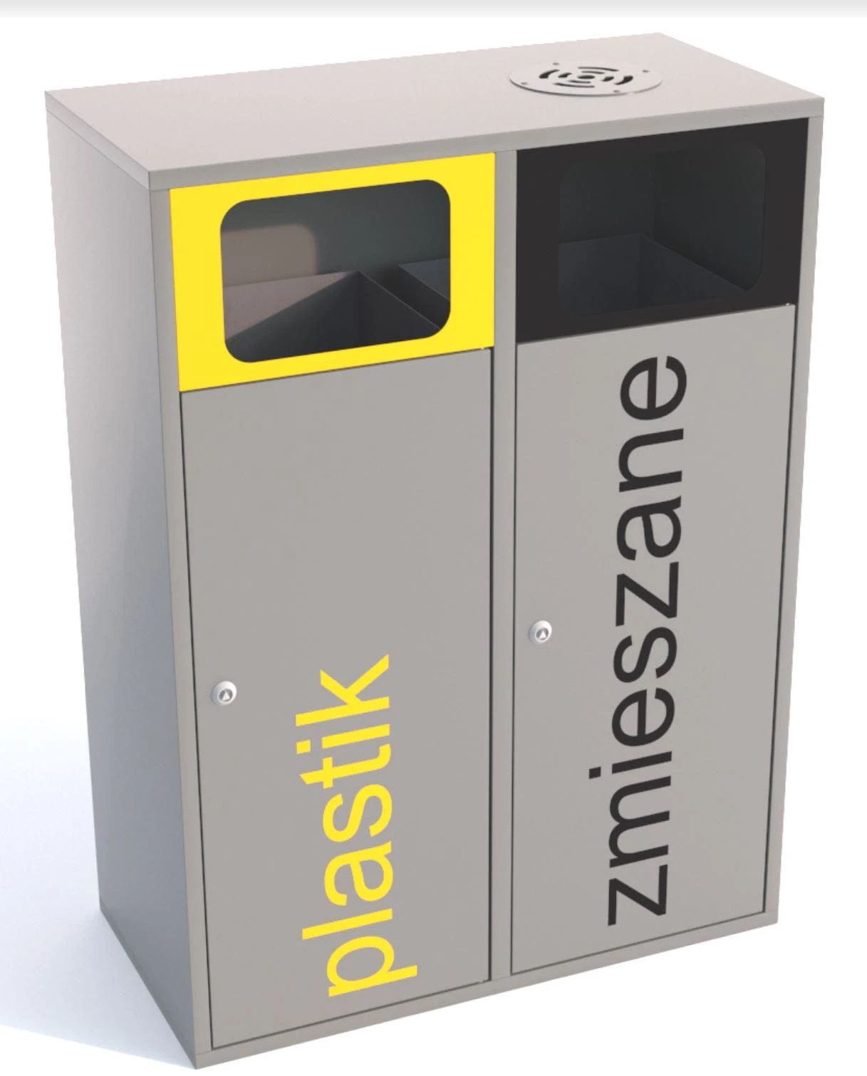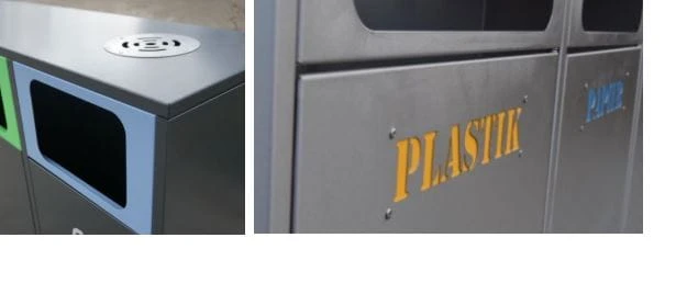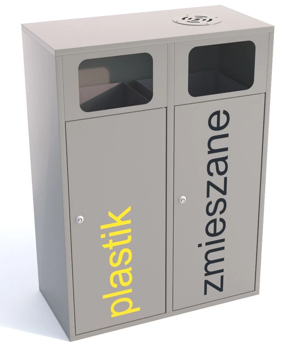 Kosz do segregacji odpadów Etna II 120 L, składa się z 2 pojemników do segregacji odpadów. Wykonany z blachy 1 mm. Kolorystyka poszczególnych pojemników dobrana jest wg standardów wspólnego systemu określonych przez Ministerstwo Środowiska.