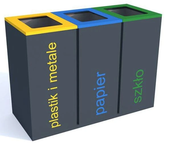 Kosz do segregacji odpadów Satis III 100 L, składa się z 3 pojemników do segregacji odpadów. Wykonany z blachy 1 mm.