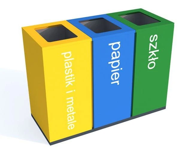 Kosz do segregacji odpadów Satis III 60 L, składa się z 3 pojemników do segregacji odpadów. Wykonany z blachy 1 mm.