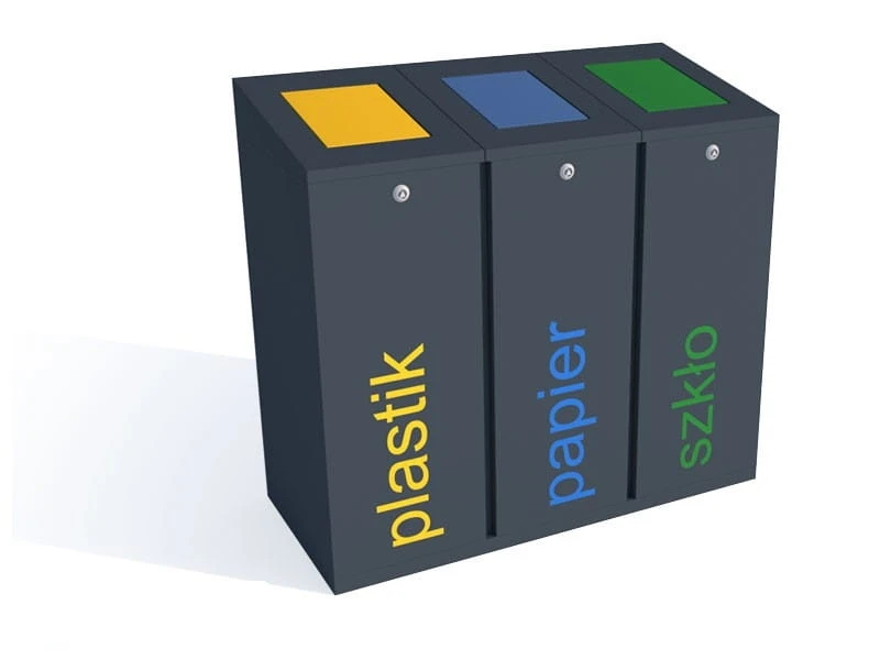 Kosz do segregacji odpadów Satis skośny III a 60 L, składa się z 3 pojemników do segregacji odpadów. Wykonany z blachy 1 mm.