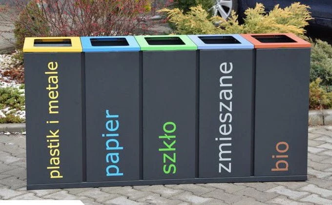 Kosz do segregacji odpadów Satis V 60 L, składa się z 5 pojemników do segregacji odpadów. Wykonany z blachy 1 mm.