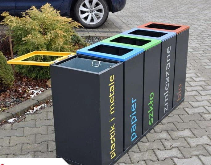 Kosz do segregacji odpadów Satis V 60 L, składa się z 5 pojemników do segregacji odpadów. Wykonany z blachy 1 mm.