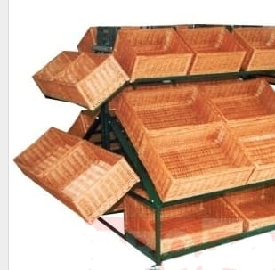 Kosze wiklinowe układa się zwykle zamiast skrzynek plastikowych na wyspach na owoce, regałach, stojakach. Często skrzynki z wikliny stosuje się również do ekspozycji chleba, bułek, wyrobów cukierniczych.