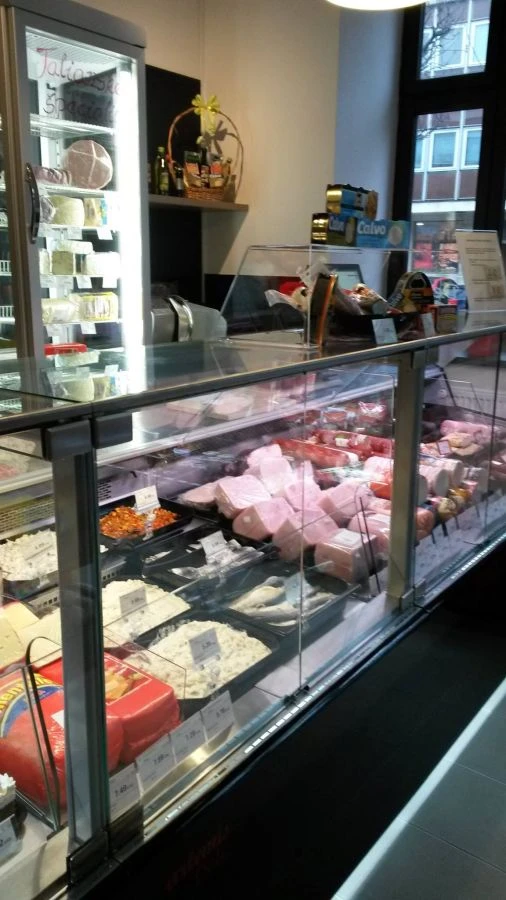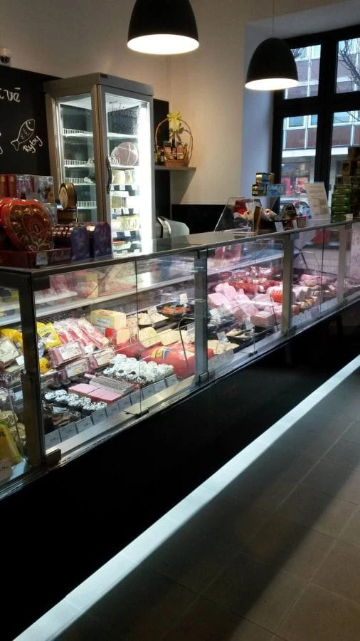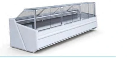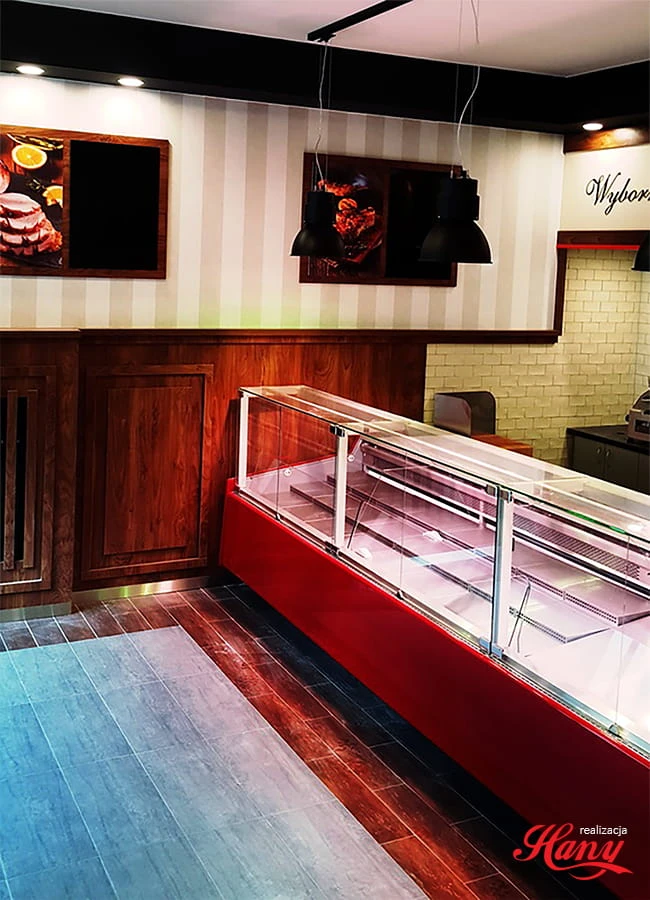 Lada chłodnicza SAMOS, wersja z agregatem wewnętrznym, lampa ze świetlówką LED (barwa do wyboru: biała, cukiernicza lub mięsna „deep pink”). W wyposażeniu przysłonki nocne z pleksy.