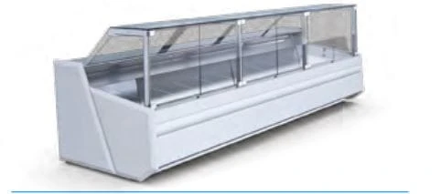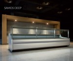 Lada chłodnicza SAMOS DEEP, wersja z agregatem wewnętrznym, lampa ze świetlówką LED (barwa do wyboru: biała, cukiernicza lub mięsna „deep pink”). W wyposażeniu przysłonki nocne z pleksy.