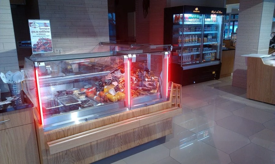 Lada chłodnicza SAMOS DEEP, wersja z agregatem wewnętrznym, lampa ze świetlówką LED (barwa do wyboru: biała, cukiernicza lub mięsna „deep pink”).