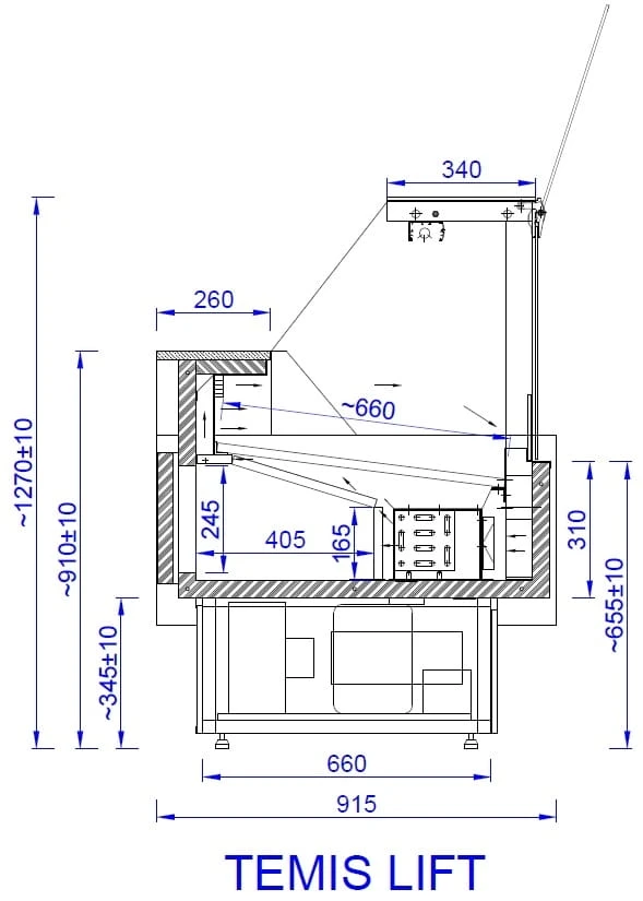 Lada chłodnicza Temis LIFT 2,5, wersja z agregatem wewnętrznym (PLUG-IN). Jednym z głównych atutów tej lady jest chłodzenie dynamiczne (obieg wymuszony), dzięki czemu produkty w niej przechowywane zachowują atrakcyjny wygląd oraz nie wysuszają się przez znacznie dłuższy czas. Lada wyposażona jest w podnoszoną na siłownikach prostą przednią szybę. W wyposażeniu znajdują się przysłony nocne z plexi