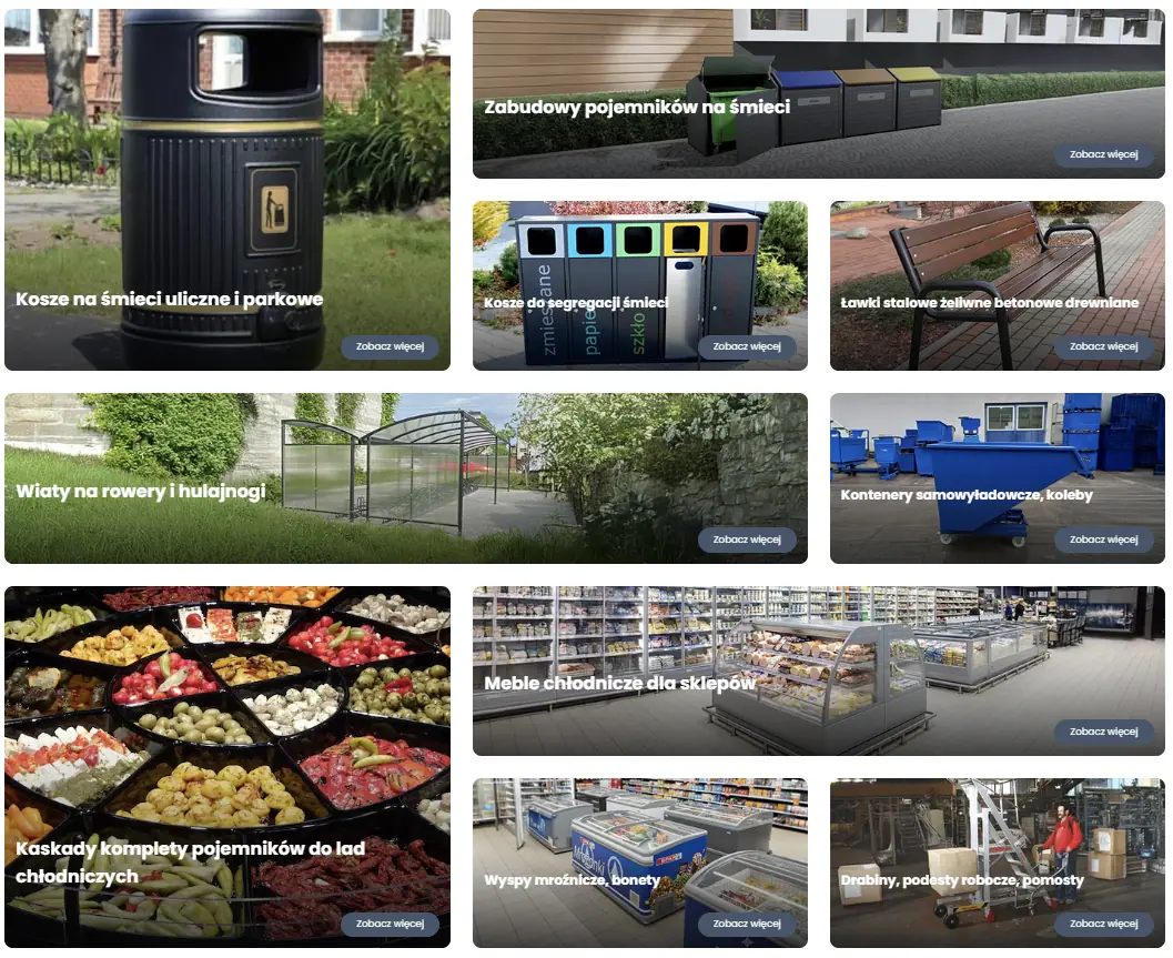 Sukcesywnie wprowadzamy nowe kategorie produktów: mała architektura i meble miejskie, wyposażenie i urządzenia dla magazynów, zakładów produkcyjnych oraz instytucji, wyposażenie placówek gastronomicznych i hoteli. Od lat oferujemy szeroki wybór wiat, zabudów pojemników na odpady, koszy miejskich, parkowych i koszy do segregacji śmieci.