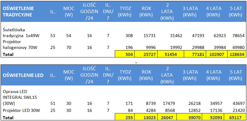 Porównałem zużycie energii przy zastosowaniu opraw na świetlówki fluorescencyjne typu T5 (tradycyjne LugTrack2) uzupełnionych projektorami metalohalogenkowymi (Robin 70W) oraz linii świetlnych LED uzupełnionych projektorami LED 30W. Nie uwzględniałem opraw ewakuacyjnych i awaryjnych.