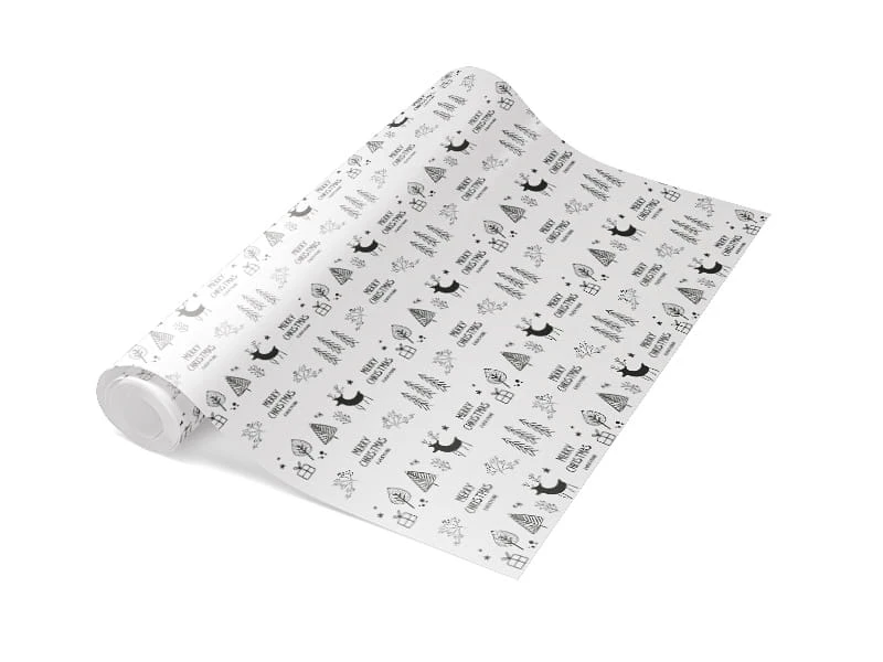 Papier pakowy atestowany z nadrukiem świątecznym Merry Christmas w nowoczesnej grafice i skandynawskim stylu. Stosowany w piekarnictwie i cukiernictwie. Nadruk dostępny jest także na kubkach, pudełkach cukierniczych i torebkach.