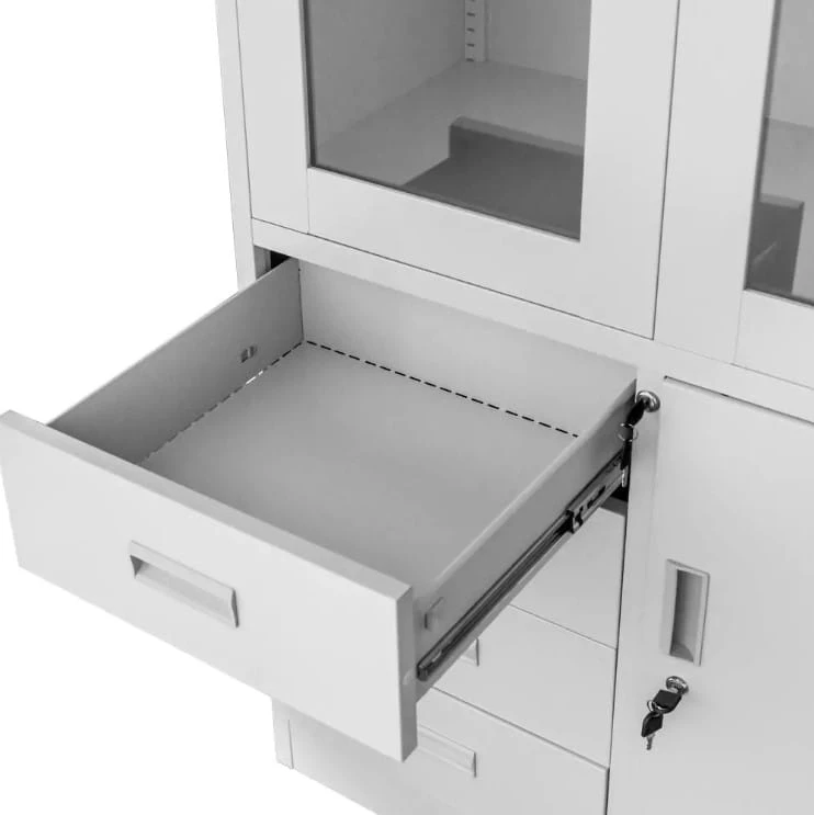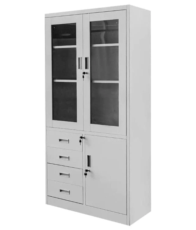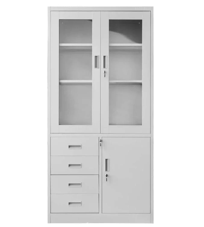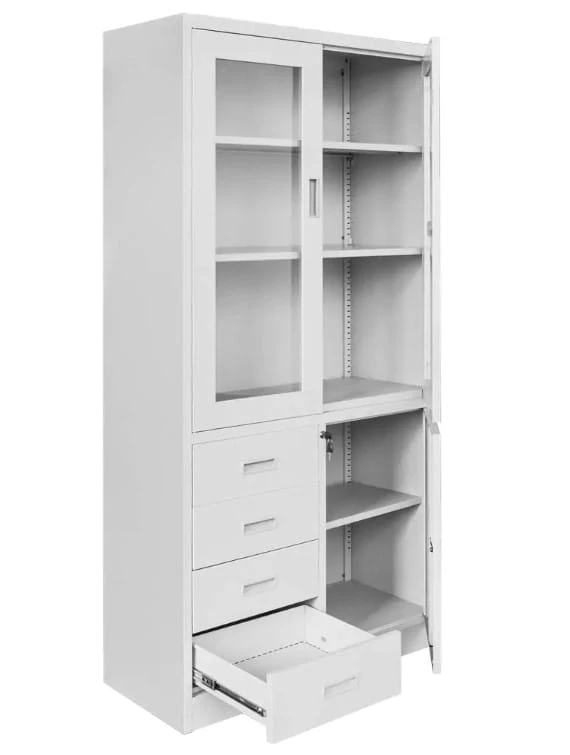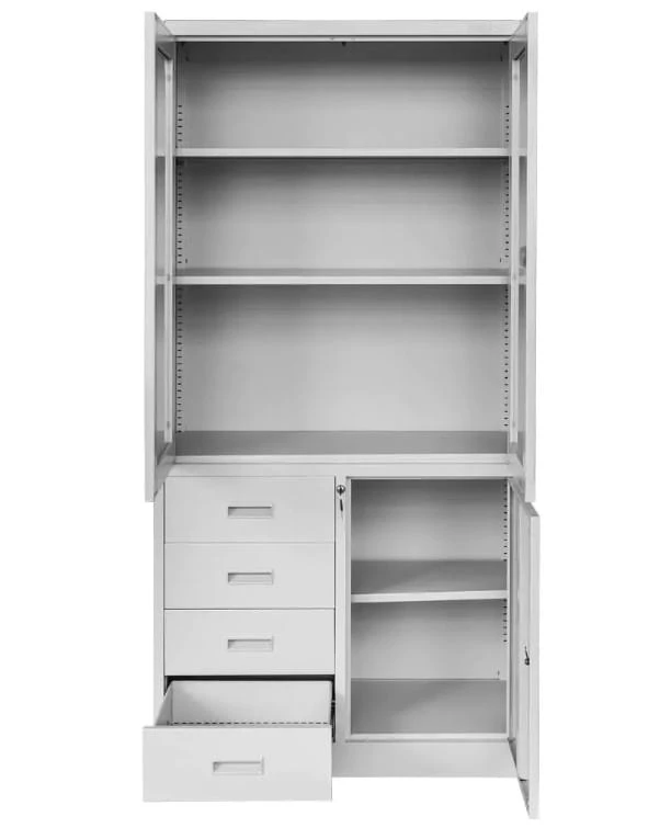 Szafa Mega-M WENUS to niezawodny mebel biurowy, który doskonale sprawdzi się w biurach, archiwach czy gabinetach. Została wykonana z wysokiej jakości blachy stalowej malowanej proszkowo, co gwarantuje jej odporność na uszkodzenia i korozję. Przeszklone drzwi zapewniają szybki dostęp do dokumentów, a cztery płynnie wysuwające się szuflady oraz dodatkowa szafka z pełnymi drzwiami oferują dodatkową przestrzeń do przechowywania.