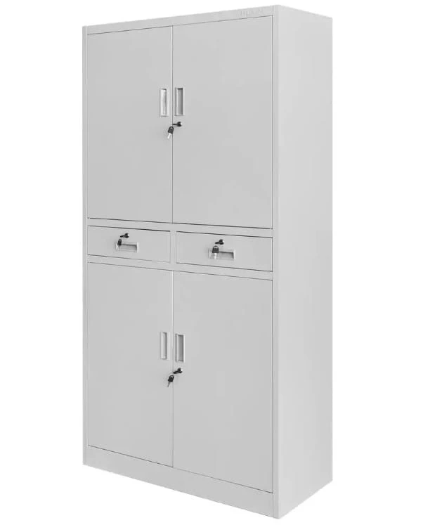 Opis produktu: Szafa biurowa Mega-M WENUS to idealne połączenie funkcjonalności i bezpieczeństwa. Wykonana z odpornej na uszkodzenia mechaniczne i korozję blachy stalowej malowanej proszkowo, zapewnia trwałość na lata. Dzięki dwóm przestronnym szafkom oraz dwóm szufladom, oferuje wystarczająco dużo miejsca na segregatory, akta i inne dokumenty. Każda sekcja zabezpieczona zamkiem gwarantuje ochronę przechowywanych materiałów. Regulowane półki umożliwiają dostosowanie wnętrza szafy do indywidualnych potrzeb.