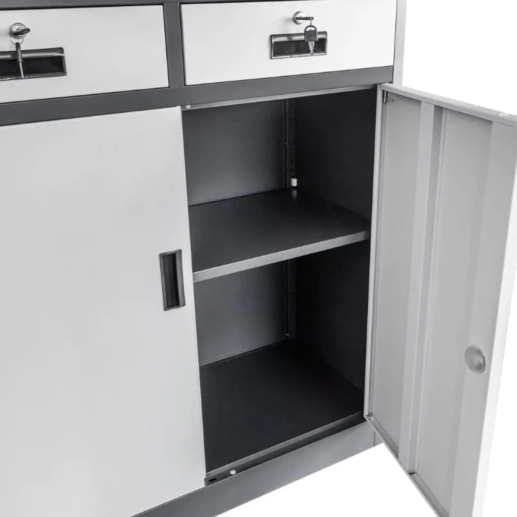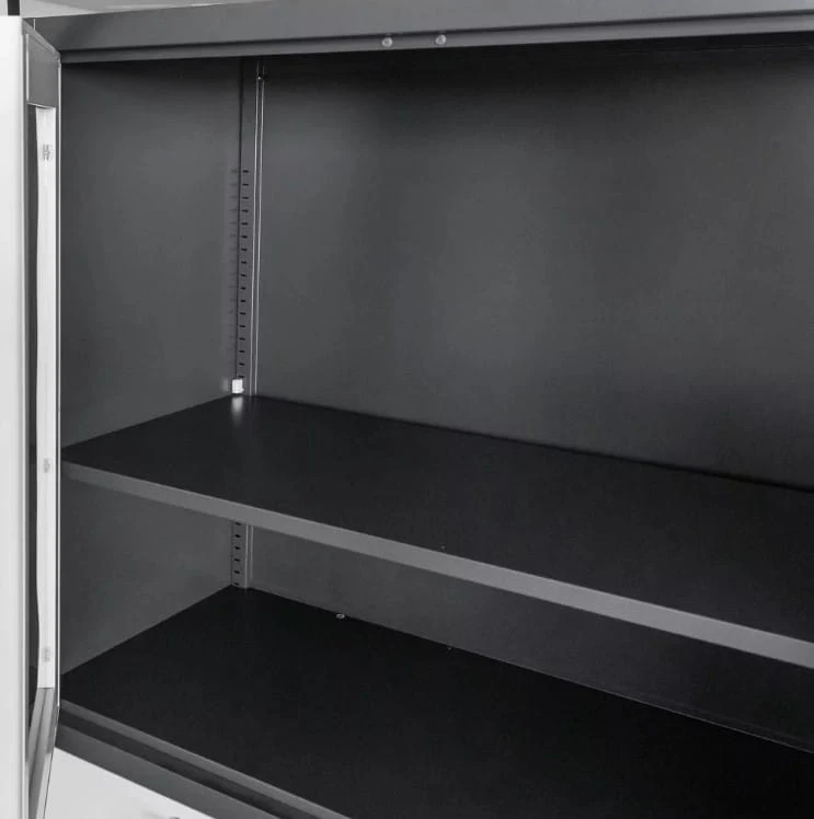 Każdy element szafy jest zabezpieczony zamkiem, co gwarantuje brak dostępu dla osób nieupoważnionych. Dwie regulowane półki umożliwiają dostosowanie przestrzeni do wielkości segregatorów, zapewniając elastyczność i wygodę użytkowania.