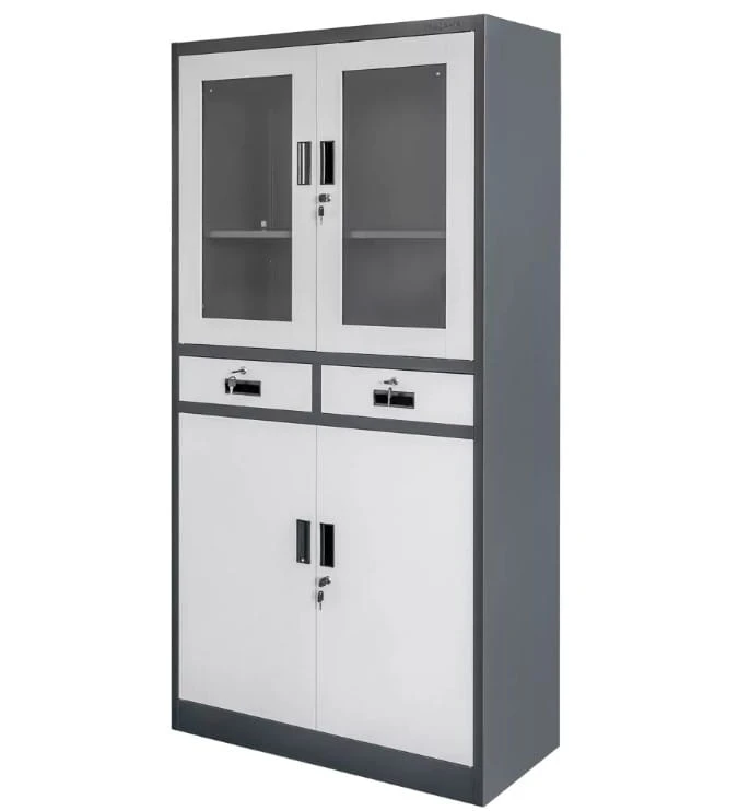 Metalowa szafa biurowa Mega-M z przeszkloną witryną, półkami i szufladami jest idealna do bezpiecznego przechowywania umów, akt i faktur zawierających dane wrażliwe. Szafa sprawdzi się w gabinetach lekarskich, przychodniach, sekretariatach, bibliotekach, urzędach, szkołach, biurach oraz szpitalach. Dodatkowo, wygodne szuflady umożliwiają przechowywanie leków, sprzętu medycznego oraz akcesoriów biurowych.
