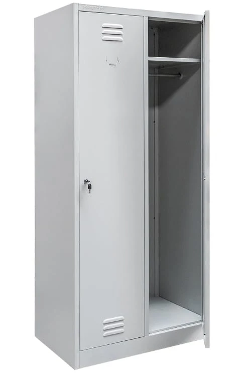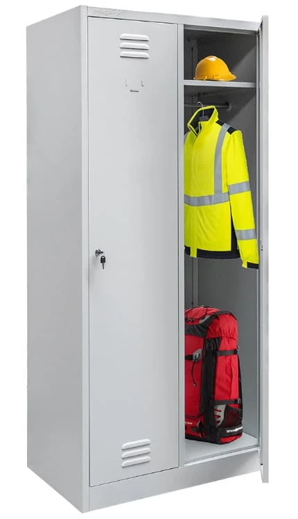 Szafka ubraniowa BHP Mega-M 2-drzwiowa z półkami i drążkiem – 80 cm, szara