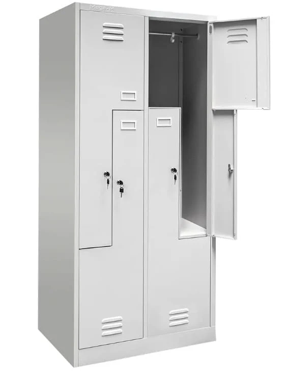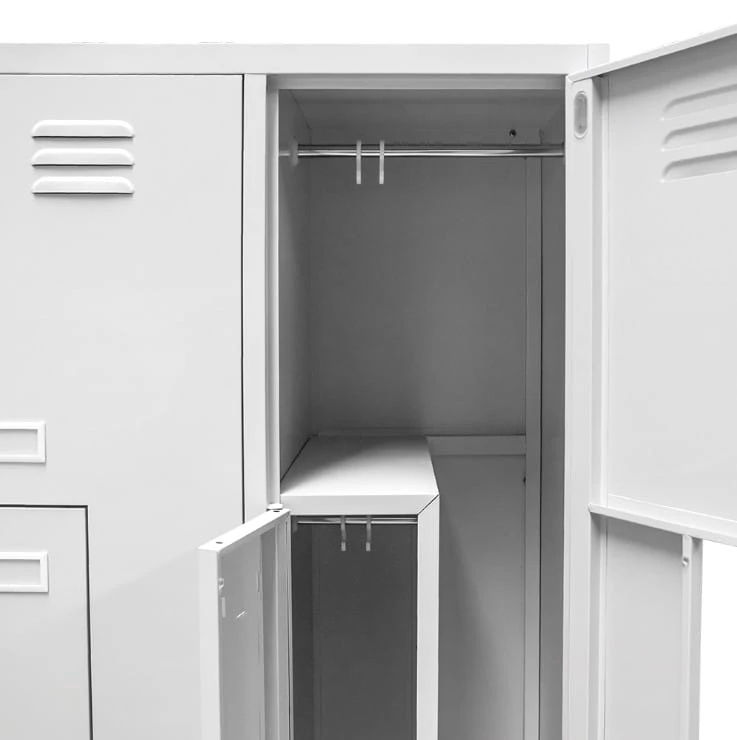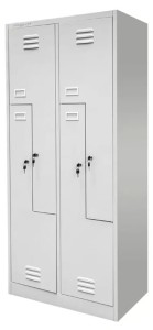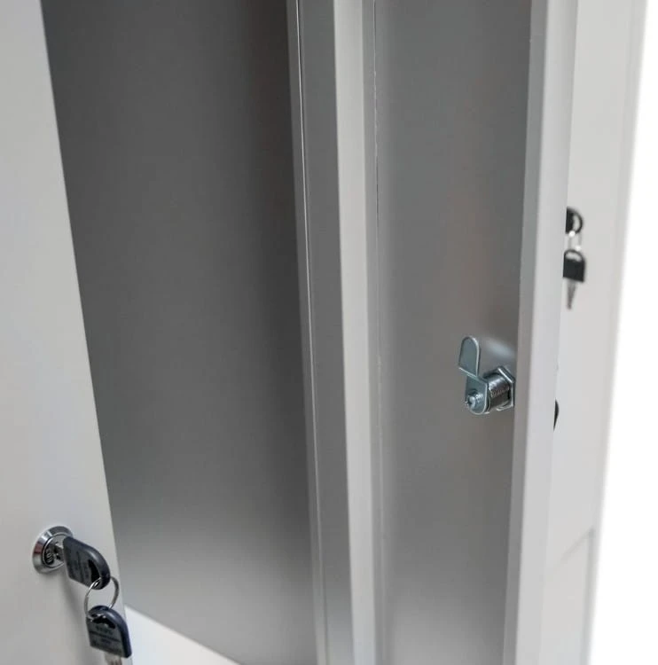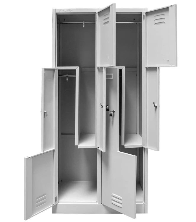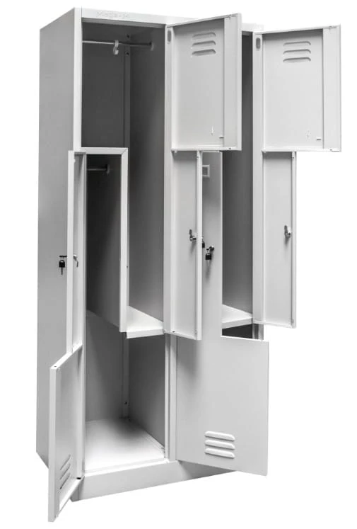 Wykonana z wysokogatunkowej blachy stalowej o grubości 0,6 mm, pokrytej trwałą farbą proszkową w odcieniu szarym RAL 7035, szafka jest odporna na korozję, zarysowania i intensywną eksploatację. Każda komora wyposażona jest w półkę, drążek z haczykami oraz skrzelowe otwory wentylacyjne, które zapewniają skuteczną cyrkulację powietrza i redukcję wilgoci.