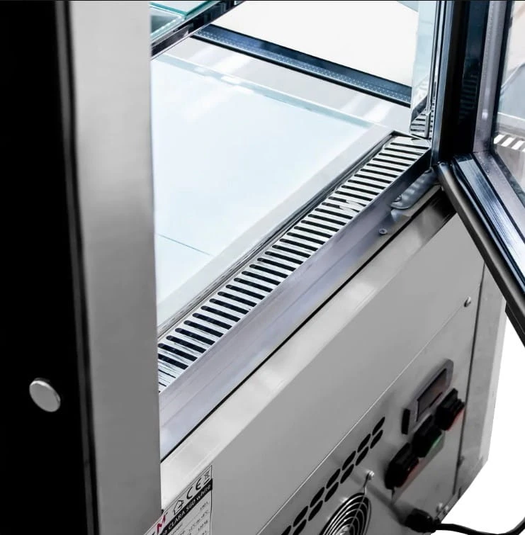 Panel sterujący Dixell pozwala na precyzyjne ustawienie temperatury w przedziale od +2°C do +8°C, a cyfrowy wyświetlacz ułatwia kontrolę warunków panujących wewnątrz witryny.