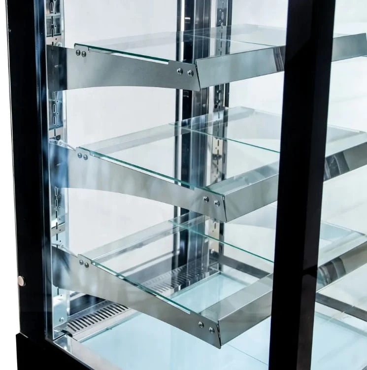 Witryna jest wyposażona w prostą szybę z podwójnie zespolonego szkła, co zapewnia optymalne właściwości chłodnicze w komorze ekspozycyjnej. Dno ze stali nierdzewnej można łatwo zdemontować i wyczyścić. Każdy poziom półek posiada oświetlenie LED dla lepszej ekspozycji produktów. Stelaż półek ze stali nierdzewnej ma wzmocnioną konstrukcję i miejsce na listwy cenowe. Trzy szklane półki z regulacją wysokości ułatwiają organizację ekspozycji. Drzwi z hartowanego szkła o podwójnej warstwie minimalizują utratę chłodu. Urządzenie ma regulowane stopki i kółka, co ułatwia jego przemieszczanie.