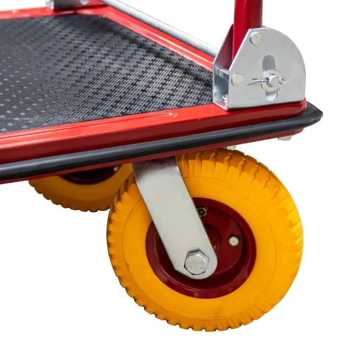 Składana rączka to oszczędność miejsca podczas przechowywania, a gumowe nakładki chronią zarówno wózek, jak i otoczenie przed uszkodzeniami. Dodatkowo, gumowe brzegi platformy zwiększają bezpieczeństwo transportu.