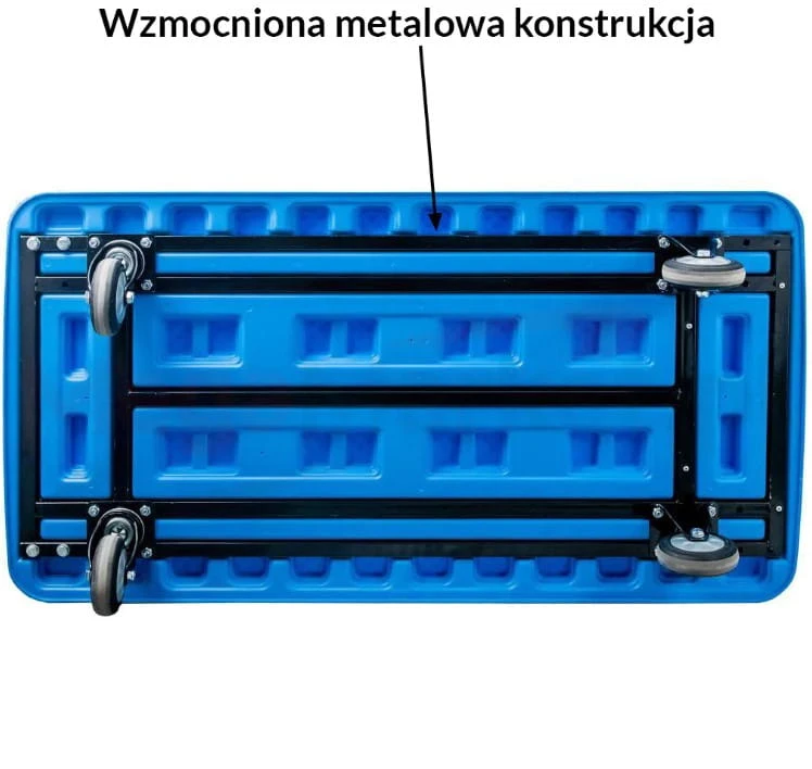 Wózek Mega-M to połączenie wytrzymałego metalowego szkieletu z platformą z tworzywa HDPE, odpornego na zarysowania i zabrudzenia. Takie połączenie gwarantuje odporność na uszkodzenia i długotrwałe użytkowanie, nawet w trudnych warunkach.