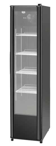 Szafa chłodnicza z drzwiami przeszklonymi 300L. Czarna stylowa szafa chłodnicza swoje zastosowanie znajdzie w kawiarniach, barach, restauracjach, klubach sportowych oraz sklepach. Idealnie się sprawdzi do przechowywania napojów i potraf. Szafa jest chłodzona powietrzem obiegowym oraz posiada funkcję odparowywania wody kondensacyjnej. Wymiary: szerokość 480 mm, głębokość 775 mm, wysokość 1995 mm.