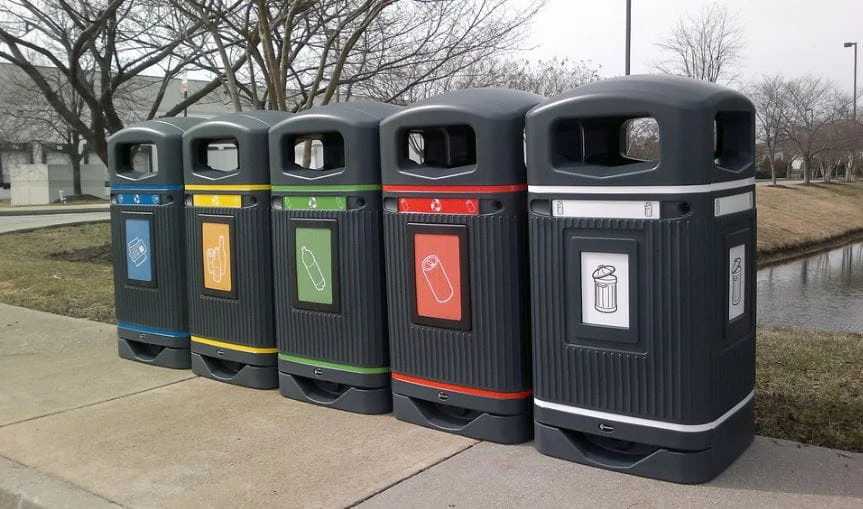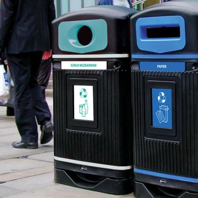 - kolorowe panele wrzutowe i grafiki dotyczące segregacji
