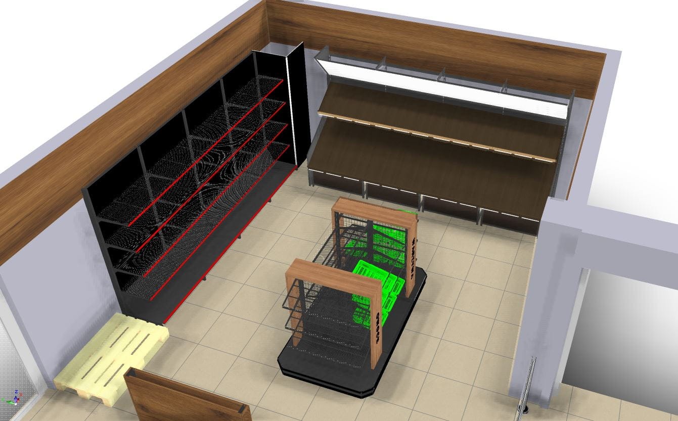 Projekt, plan sklepu, ustawienie mebli na sali sprzedaży, layout