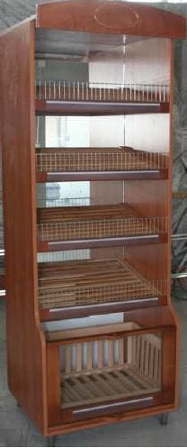 Regał na pieczywo pakowane, 1 kosz i 4 półki z drewna bukowego, z podświetleniem led, wys. 225cm, szer. 80cm, gł. 70cm, 4 półki z lustrem