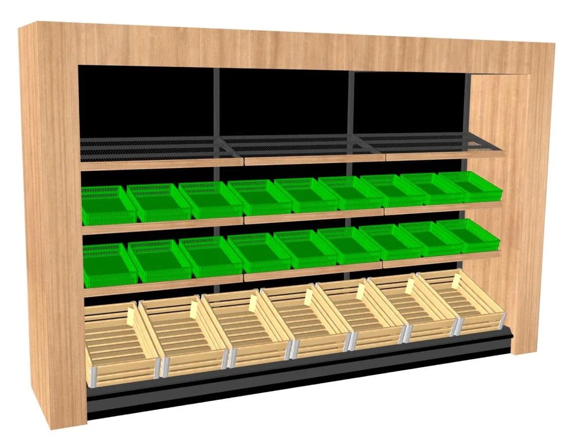 Regał na owoce i warzywa idealny dla sklepów 50-300 mkw. Głębokość jedynie 56 cm (pozwala na umieszczenie go nawet gdy jest niewiele miejsca).