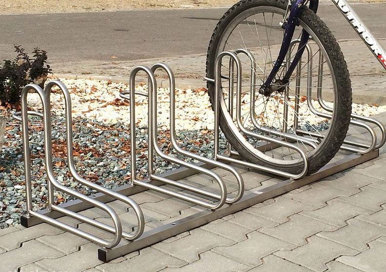 Stojak rowerowy RAD-4 ze stali nierdzewnej na sześć stanowisk rowerowych. Przeznaczony jest do parkowania wszystkich typów i wielkości rowerów, również tych wyposażonych w hamulce tarczowe.