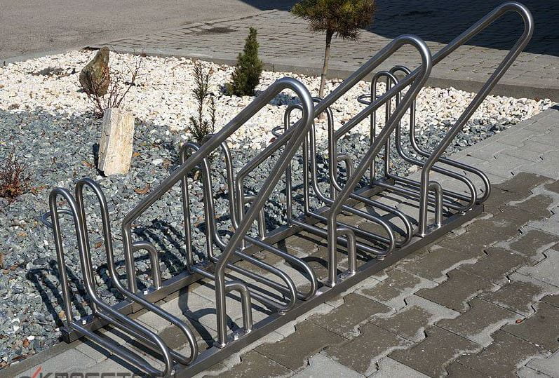 Stojak rowerowy RAD-4 na cztery stanowiska rowerowe z dodatkową barierką wykonany ze stali nierdzewnej. Przeznaczony jest do parkowania wszystkich typów i wielkości rowerów, również tych wyposażonych w hamulce tarczowe.