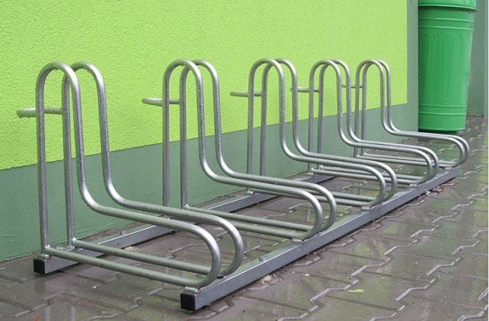 Stojak rowerowy RAD-5 na pięć stanowisk rowerowych. Przeznaczony jest do parkowania wszystkich typów i wielkości rowerów, również tych wyposażonych w hamulce tarczowe.