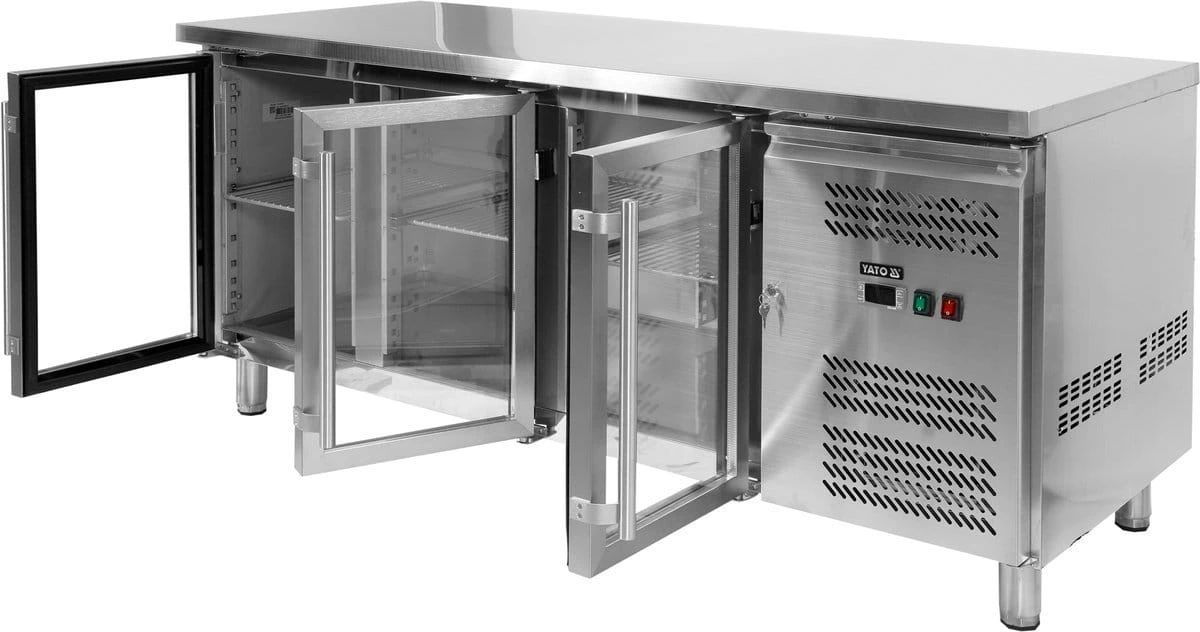 Stół do przechowywania żywości z bocznym agregatem oraz drzwiami z podwójnego, hartowanego szkła.