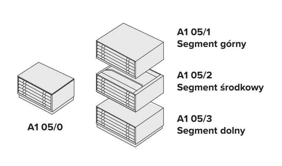 W szafach kartotekowych z serii A1 istnieje możliwości montażu dodatkowej sekcji przejściowej, środkowej pięcioszufladowej, zwiększającej objętość modułu do 15 szuflad. Szuflady wyposażone są w zacisk przytrzymujący dokumenty oraz dwie przegrody dla rozdzielenia mniejszych formatów.