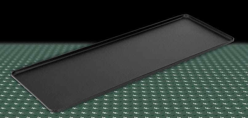 Wymiary 40 x 30 cm, 4 ranty (zawinięte brzegi) o wysokości 1 lub 2 cm - mierzone na zewnątrz tacy.