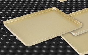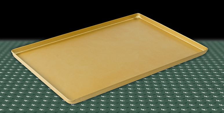 Powierzchnia tac w kolorze złotym i szampan poddawana jest w trakcie produkcji specjalnej obróbce. Najpierw trawieniu (aluminium uzyskuje ładną, jednolitą srebrną barwę), a następnie procesowi anodowania, który chroni aluminium przed korozją i podnosi twardość powierzchni. W końcowej fazie tace zabarwia się chemicznie na kolor szampana lub złoty.