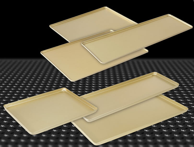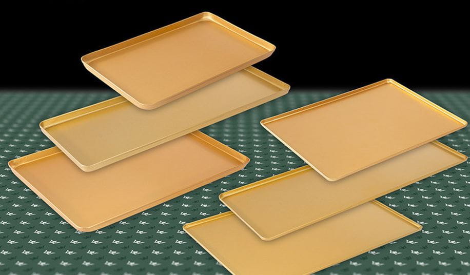 Powierzchnia tac w kolorze złotym i szampan poddawana jest w trakcie produkcji specjalnej obróbce. Najpierw trawieniu (aluminium uzyskuje ładną, jednolitą srebrną barwę), a następnie procesowi anodowania, który chroni aluminium przed korozją i podnosi twardość powierzchni. W końcowej fazie tace zabarwia się chemicznie na kolor szampana lub złoty.