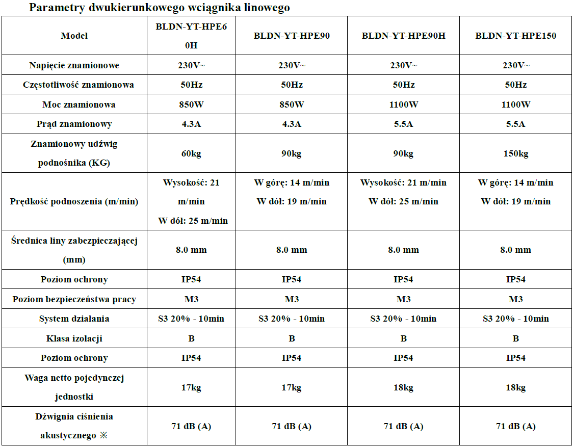 Wciągarka elektryczna linowa BLND-YT-HPE90H, 90kg, 1100W, lina 20m